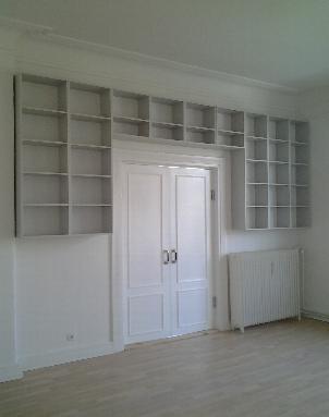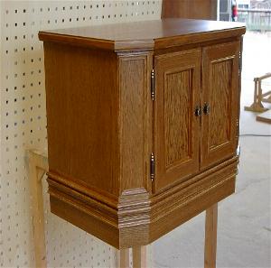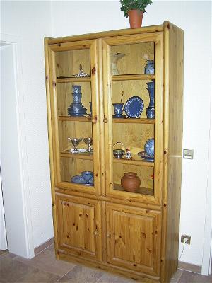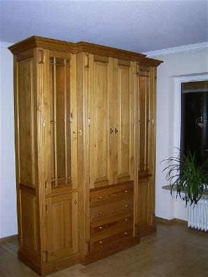 Jugendstilschrank in Rahmenbauweise. Obere mittlere Türen können seitlich eingeschoben werden und geben die Multimedia-Anlage frei.