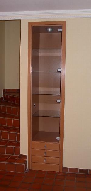 Jugendstilschrank in Rahmenbauweise. Obere mittlere Türen können seitlich eingeschoben werden und geben die Multimedia-Anlage frei.